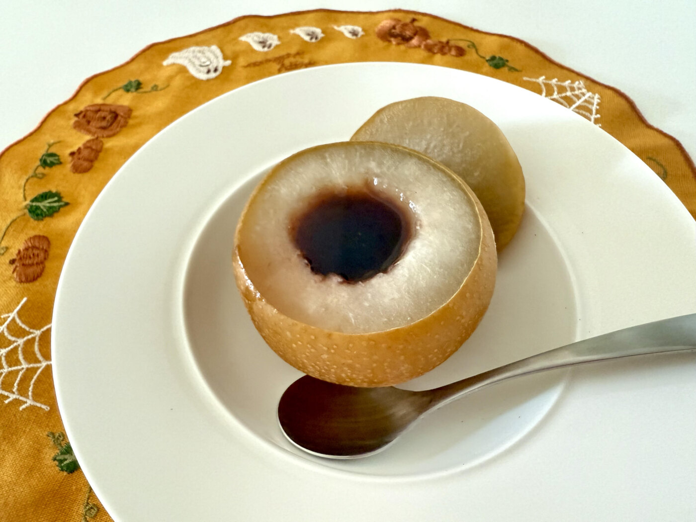 今回のアレンジレシピは、中国薬膳で喉の不調に効果があるデザートとして親しまれている蒸した梨「氷糖燉梨子(ヒョウトウトンリシ)」をご紹介いたします。